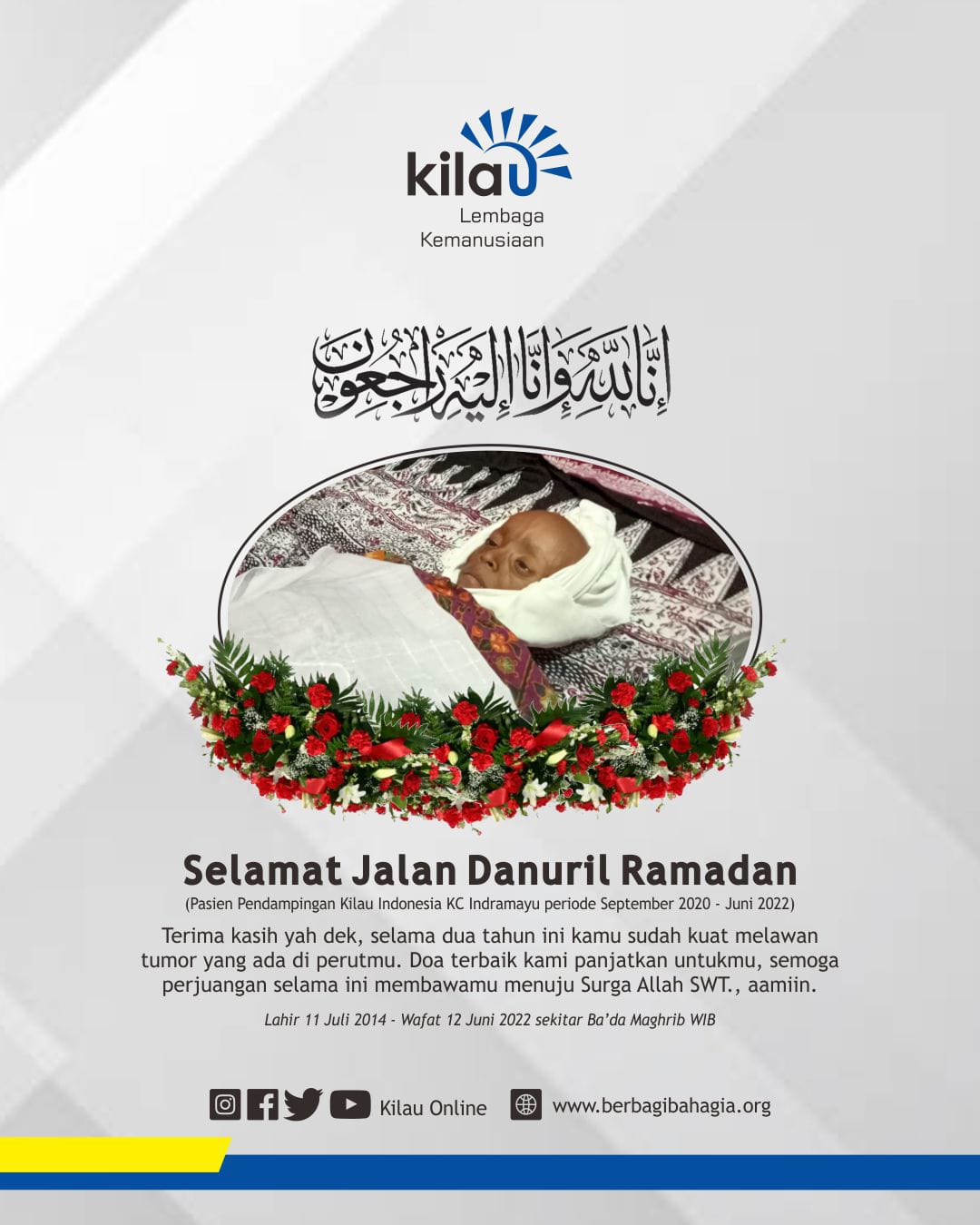 Innalillahi Wa Innailaihi Rojiu'n, telah berpulang ke rahmatullah, Danuril salah satu pasien pendampingan Kilau Indonesia Cabang Indramayu, yang menghembuskan nafas terakhirnya tepat pada tanggal 12 Juli 2022 yang berlokasi di kediamannya.