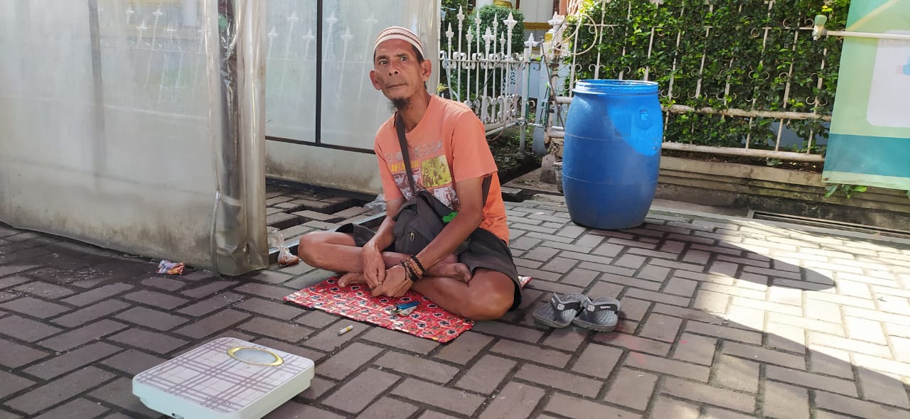 Karena keterbatasannya Pak Dadang hanya bisa duduk di depan pintu masuk Masjid Agung Sumedang untuk menawarkan jasanya kepada setiap orang yang akan masuk ke dalam masjid.