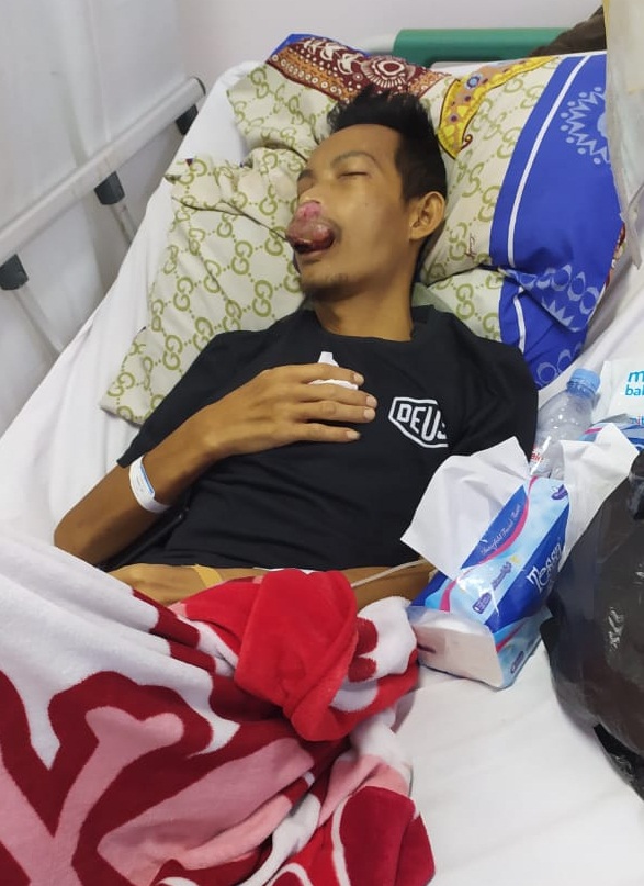 Bapak Ali Kadar (43) asal Pamulihan, Sumedang yang saat ini terbaring lemas di RSUD Sumedang. Beliau menderita Tumor di mulut bagian atas yang menyebabkan bengkak sebesar tangan orang dewasa dan menutupi hidung dan mulut beliau.